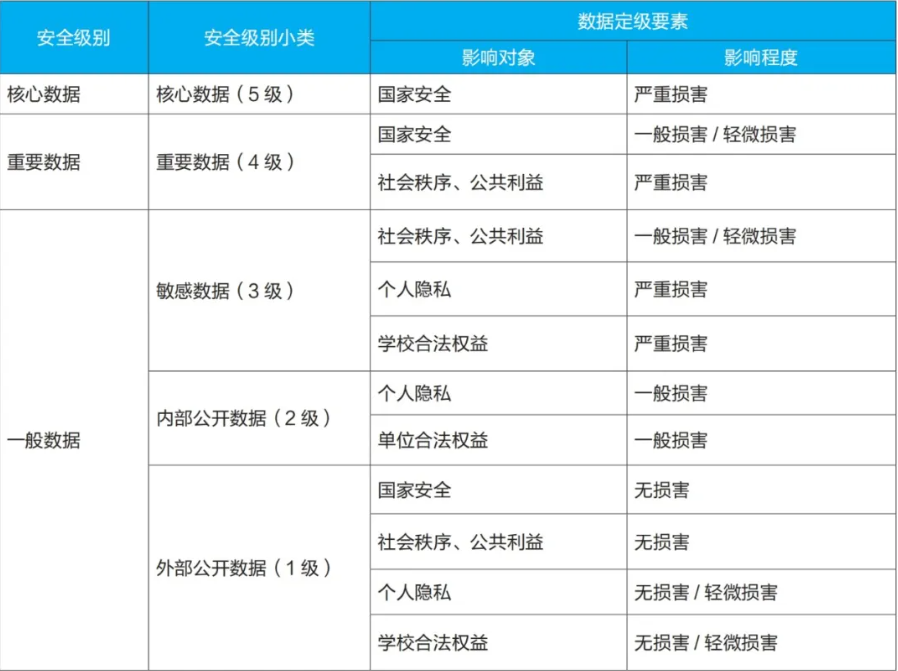 教育部在《识别认定指南》中将教育数据按照重要性、精度、规模、安全风险等分为核心、重要、一般三级。其中,核心数据是指在教育系统内具有较高覆盖度或达到较高精度、较大规模、一定深度的重要数据,一旦被非法使用或共享,可能直接影响政治安全;重要数据是指在教育系统内达到一定精度和规模的数据,一旦被泄露或篡改、损毁,可能直接危害国家安全、经济运行、社会稳定、公共健康和安全,仅影响组织自身或公民个体的数据,一般不作为重要数据;一般数据是指除核心数据和重要数据之外的其他教育数据。