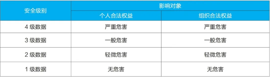 按照数据资产一旦遭到篡改、破坏、泄露或者非法获取、非法利用,对个人、组织合法权益造成的危害程度,将一般数据从低到高分为四个安全级别,具体内容见表1。