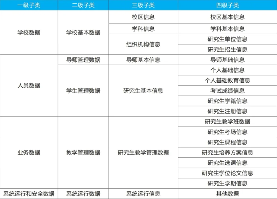 中国农业大学数据分为学校数据、人员数据、业务数据、系统运行和安全数据四个一级子类。