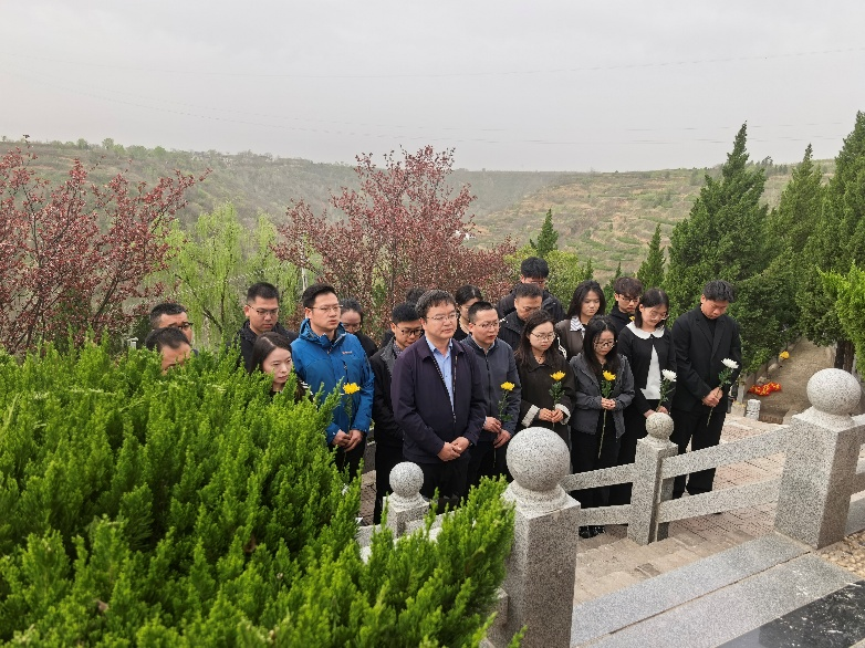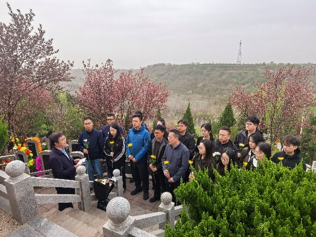 白鹿原公墓内松柏苍翠、庄严肃穆,徐精彩教授墓园静谧肃穆,承载着后人对这位行业先驱的无尽敬仰与深切怀念。活动伊始,全体党员同志身着素净服装,在墓园前整齐列队,神情庄重肃穆,全场肃立静默,向为国家煤矿安全事业鞠躬尽瘁、奉献一生的徐精彩教授默哀三分钟。低沉肃穆的氛围中,每一位党员都心怀崇敬,深切缅怀徐精彩教授为我国消防工程、煤矿安全领域以及我校安全工程学科建设作出的卓越贡献,追思他爱岗敬业、无私奉献的崇高品格。